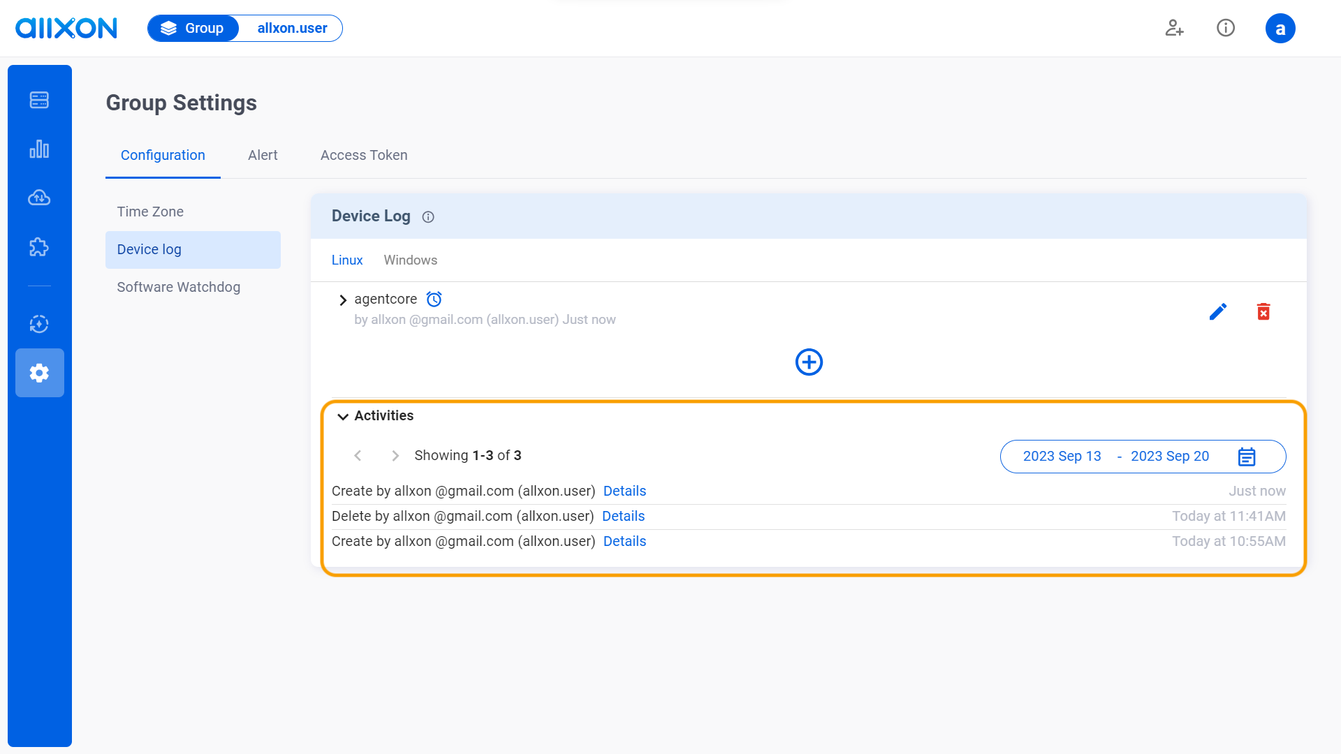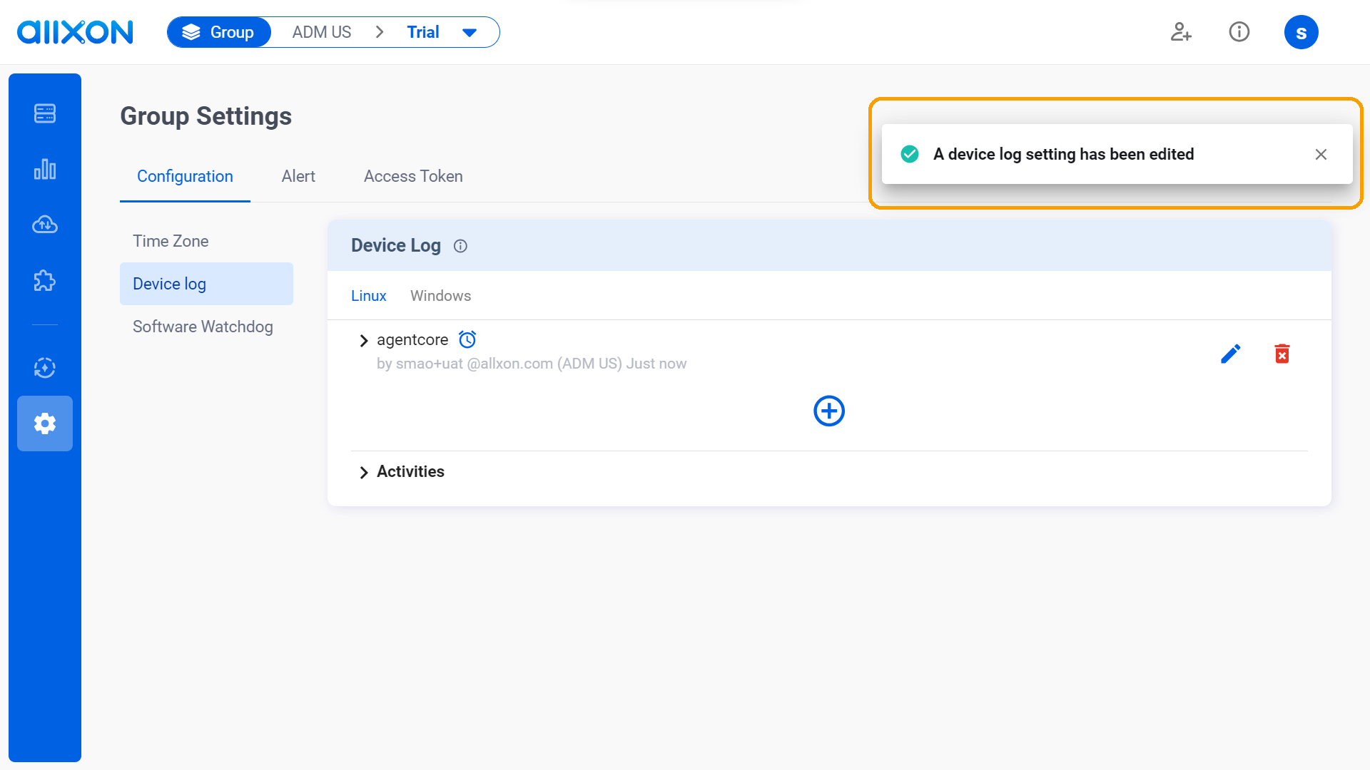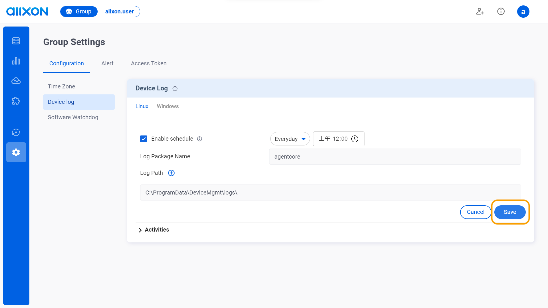 Allxon Agent can collect logs from your device. For your convenience, you can set up to 5 sets of log settings (with 8 log paths) that command the Agent to collect the logs periodically, or for you to collect the logs manually.