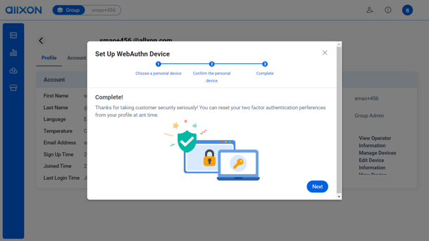 - This completes setting up the web authentication on your personal device. The next time you log into your Allxon account, you’ll be prompted to authenticate through your personal device’s sign-in screen. Click Next to complete the process.